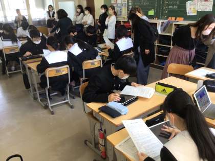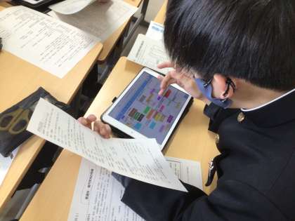 3年生は進路についての授業を公開していました。学習用タブレットを活用して、いろんな学校について調べていました。