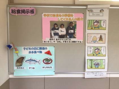 今月の給食の掲示板です。全校生徒の給食に関わる仕事をしている3名の方の紹介がされています。また、子どもの日に関連した食材が紹介されていました。