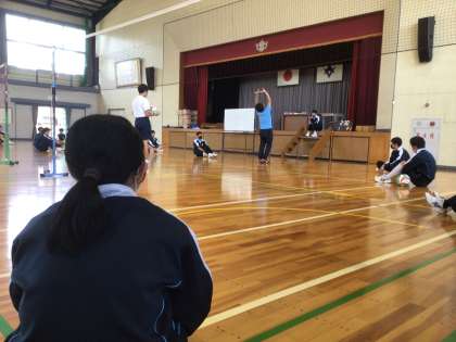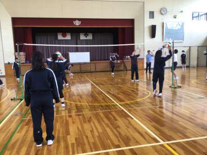3年生の保健体育科の授業の様子です。バレーボールに取り組んでいます。今日は2人組で、基礎技能を学んでいます。