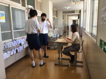2年生の外国語科の授業の様子です。電話での会話をペアで練習していました。その後、ALTのの先生に見てもらい、アドバイスを受けていました。