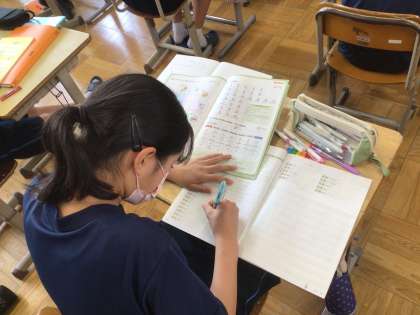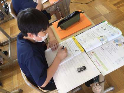 1年生の外国語科の授業の様子です。丁寧な文字で英単語を書いて練習しています。1年生の外国語科の授業で学習する単語の量が増えています。学校で学んだあと、家庭で復習をすると定着量が増えてきます。家庭での復習ができるといいですね。