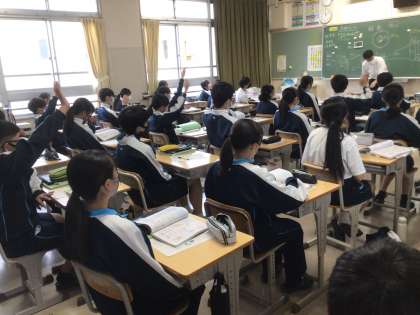 3年生の理科の授業の様子です。デジタル教科書をプロジェクターで黒板に投影して授業を進めています。各教科、デジタル教科書を積極的に活用しています。