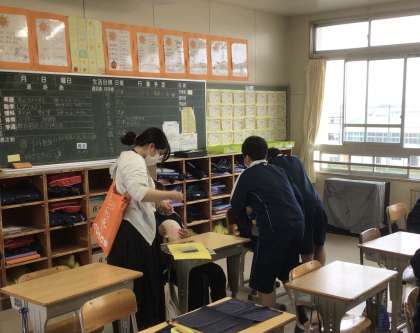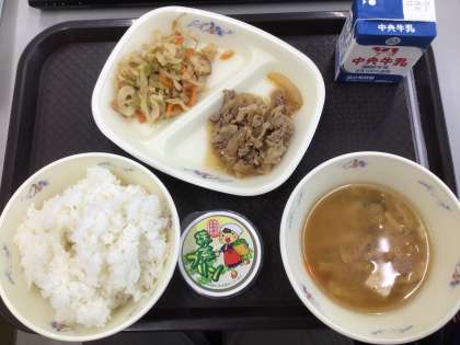 今日の給食は「豊田ブランド」の献立です。とよたひまわりポーク、ごはん、にんじん、豆腐、油揚げ、茶(抹茶プリン)が豊田で作られているものです。抹茶は、1年に1回の貴重なメニューです。給食後には、松岡先生(栄養教諭)が2年生の教室を訪問し、給食について生徒と話していました。