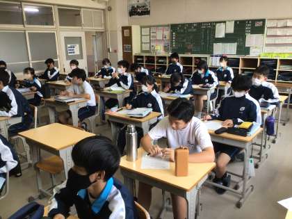 3年生の外国語科の授業の様子です。問題を解くときのポイントや、解説をしています。分かりやすくするために、プロジェクターを活用し、書き込みながら進めていました。