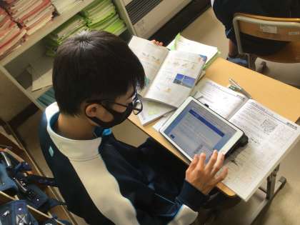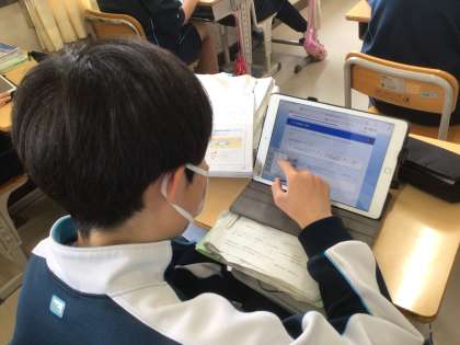 3年生の理科の授業の様子です。授業で学んだことを学習用タブレットを活用して、まとめています。生徒の「振り返り」をデータ化して、次の授業に生かしています。