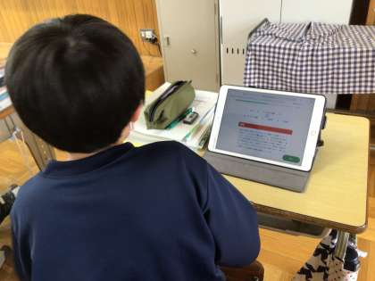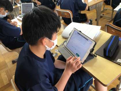1年生の社会科の授業の様子です。テスト直前ということもあり、学習用タブレットのアプリを活用して、問題に取り組んでいました。AI型教材のため、問題につまずくとAIがその問題をクリアするための、補足の問題を出題するなど、その生徒に合わせた学習ができるように工夫されています。「個別最適な学び」をめざしています。