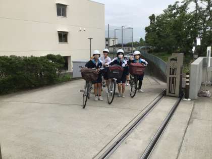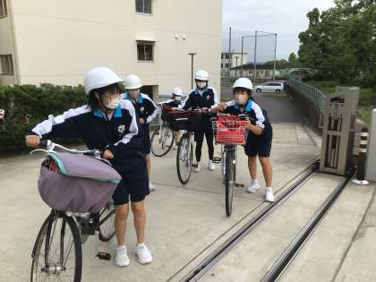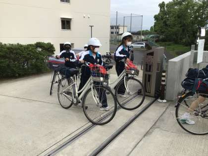 本校は、自転車通学者の多さが、一つの特色となっています。全校生徒が一斉に下校すると、大変混雑するため、できるだけ分散して下校できるように、工夫しています。一つの工夫として、男女別の清掃を行い、下校に時間差をつけています。