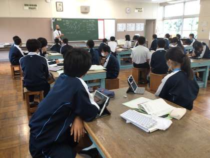 2年生の技術科の授業の様子です。プログラミング学習に取り組んでいます。学習用タブレットを活用し、円を描くプログラムを入力していました。実際にプログラム通りにできているか、確かめていました。
