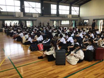 3年生は今日から修学旅行です。朝、いつもより早い登校ですが、みんな元気に集合しました。これから出発式です。