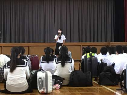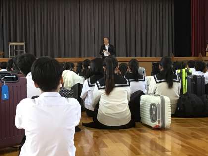 3年生の出発式の様子です。校長先生より、「楽しい思い出をたくさんつくり、安全に帰ってきて家族に話してほしい」と話がありました。生徒代表より「豊田との違いや魅力を発見することと友情を深めよう」と呼びかけられました。