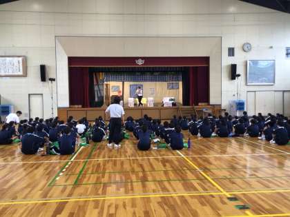 1年生は、家庭科の学習として、消費生活センターの方を講師に招き、「消費生活講座」を行いました。また、「笑劇波」に公演をしていただきました。楽しく学ぶことができました。
