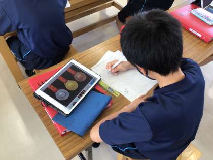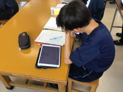 1年生の美術科の授業の様子です。自分の名前のロゴデザインをつくっています。学習用タブレットを使い、いろんなデザインを参考にしていました。メダルのデザインを参考にしている生徒がいました。