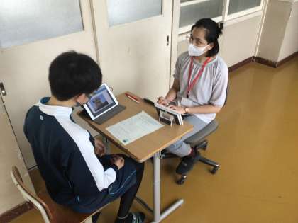 3年生の英語科の授業の様子です。今日は、ALTのパウラ先生へ、修学旅行でのエピソードを、学習用タブレットに用意した写真を見せながら英語で話していました。