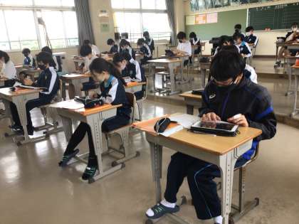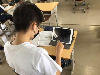 3年生の音楽科の授業の様子です。学習用タブレットのアプリを活用してピアノ演奏の練習をしていました。曲は「ブルタバ(モルダウ)」です。