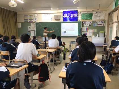 3年生の理科の授業の様子です。位置エネルギーと運動エネルギーについて学習していました。ジェットコースターを例にして考えていました。