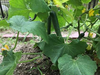 ハピスマの畑です。先日、立派に育った「きゅうり」を収穫しました。今日、畑を見たら、きゅうりとピーマンがすくすくと育っていました。次の収穫が楽しみです。