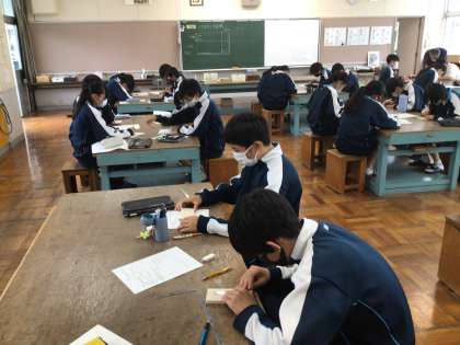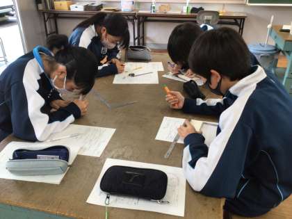 3年生の技術科の授業の様子です。けがき作業をしていました。道具の使い方を学び、実際に作業を進めていました。仲間と教え合う場面も見られました。