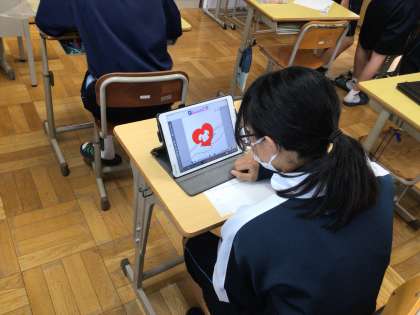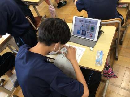 1年生の総合的な学習の時間の様子の続きです。チラシのデザインを学習用タブレットのアプリを活用して考える生徒もいます。学習用タブレットがノートのようになっています。