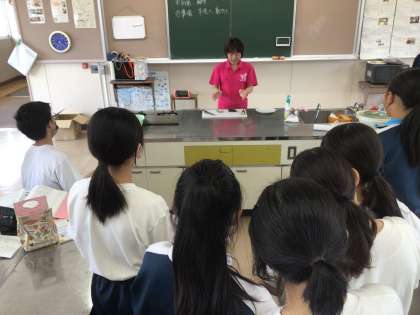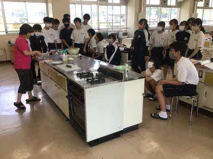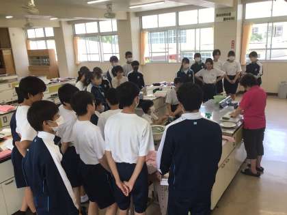 2年生の家庭科の授業の様子です。きゅうりの輪切りについて学習していました。次回は、輪切りのテストをすると伝えられていました。包丁の持ち方をじっくりと説明していました。