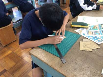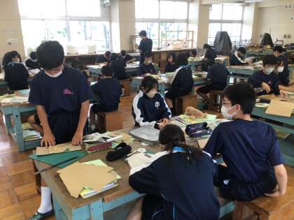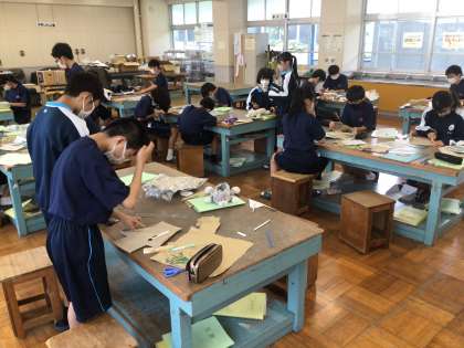 1年生の技術科の授業の様子です。小物づくりに取り組んでいます。段ボールをそれぞれの材料とする形に、切り取っていました。