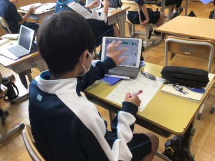1年生の数学科の授業の様子です。文字式の計算に取り組んでいました。学習用タブレットに出てくる問題を解き、解説を読み、どこを間違えたのかを確認していました。