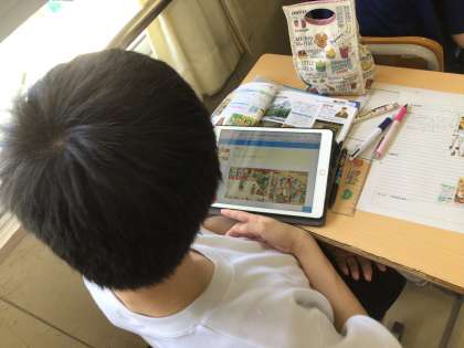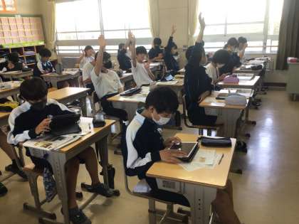 2年生の社会科の授業の様子です。桃山文化の特色について学習していました。学習用タブレットの資料を見て、気づいたことを書き込んでいました。