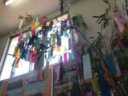3年生の廊下に笹飾りがありました。七夕ですね。どんな願い事を書いているのでしょうか。