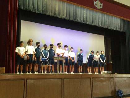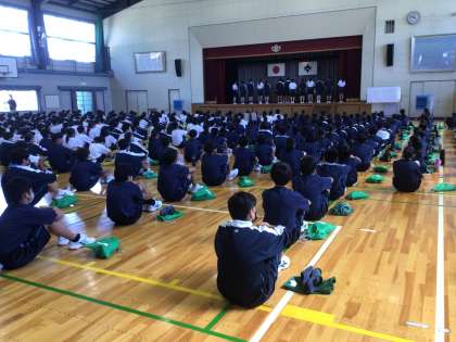 夏休み前の全校集会を行いました。全校生徒が体育館に集まり実施しました。久しぶりに全校生徒が体育館に集まりました。表彰伝達、校長先生の話や夏休みに意識してほしいことを伝えるなど、有意義な時間を過ごすことができました。夏休みの生活で気をつけることを、3年生が寸劇で発表していました。