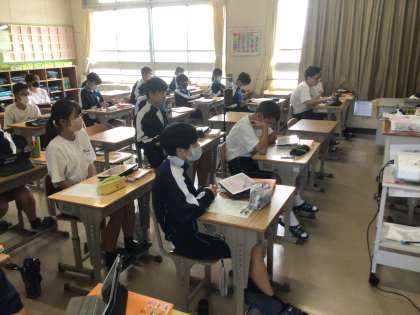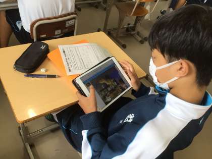 2年生の英語科の授業の様子です。ALTの先生とのスピーチのために、原稿を準備していました。伝えたいことを伝えるために、学習用タブレットを活用して、写真資料を準備している生徒もいました。