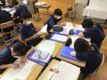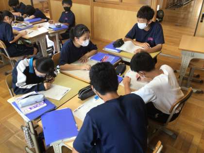 1年生の数学科の授業の様子です。方程式の復習プリントに取り組んでいました。分からないところを互いに教え合っていました。