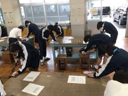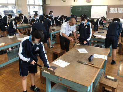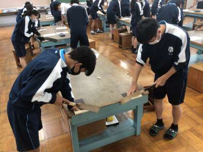 3年生の技術科の授業の様子です。実際にのこぎりを使って木材を切断していました。