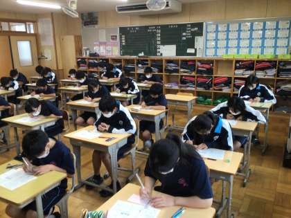 前期期末テストが始まりました。期末テストは、9教科のテストを行います。1年生は、初めての9教科のテストとなります。今までの学習の成果を発揮できるように、どの生徒も集中して問題を解いていました。写真は、1年生のテストの様子です。