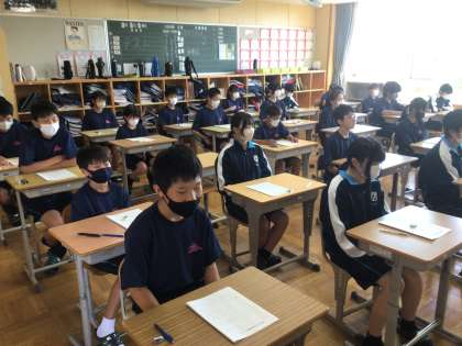 写真は、最後のテストに取り組む1年生の様子です。