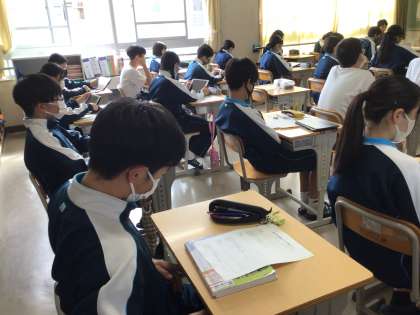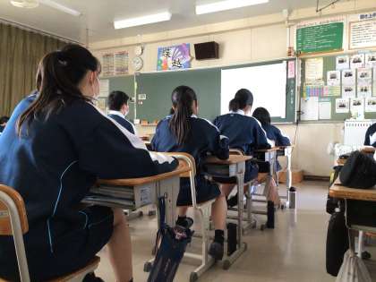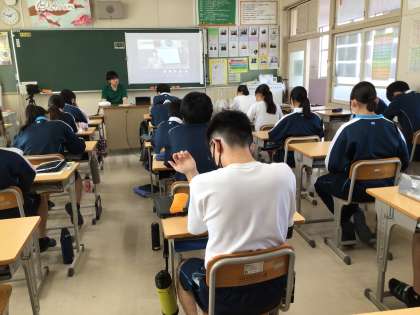 3年生の進路学習の様子です。進路担当から今後の進め方の説明がされたあと、進路先として考えている学校について、学習用タブレットを活用して調べていました。