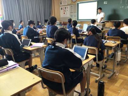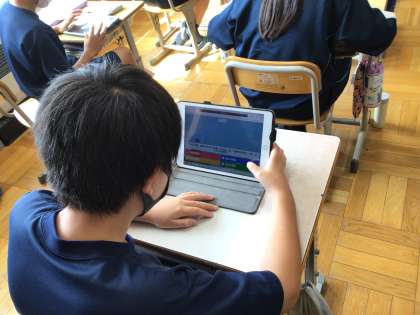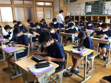 1年生の国語科の授業の様子です。文の組み立ての内容を復習するために、学習用タブレットを活用していました。授業者が作成した復習問題に取り組んでいました。