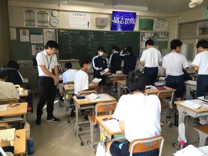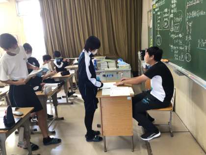 3年生の数学科の授業の様子です。二次関数の問題を解いていました。問題を解いた生徒は、授業者へ解き方を説明していました。週一回、学生のボランティアも一緒に学んでいます。