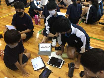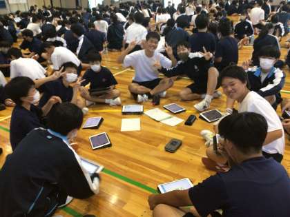 学習用タブレットを使って最後のゲームをしていました。猿投中学校といえば「何」という課題に対して、多くの生徒が「あいさつ」と書き込んでいました。また、体育祭といえば「何」という課題では、「リレー」と書き込む生徒が多くいました。全校生徒が集まる機会が少しずつ増えていますが、インフルエンザやコロナウイルスなどの感染症の拡大状況を考慮しつつ、安心・安全な学校生活を送ることができるように努めていきます。