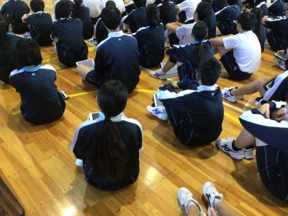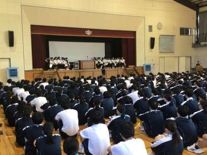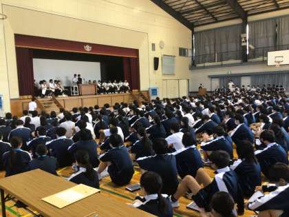 午後から後期生徒会役員選挙が行われました。体育館での立会演説会の様子です。立候補者のポスターは、生徒の学習用タブレットで配信してあり、それを参考にしながら各候補者の演説を聞いていました。