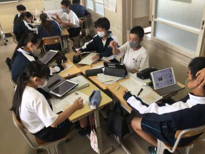 2年生の社会科の授業の様子です。近畿地方の学習をしていました。グループごとに、近畿地方の自然環境の特色や、歴史的な建造物、特産品などを出し合っていました。