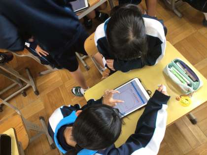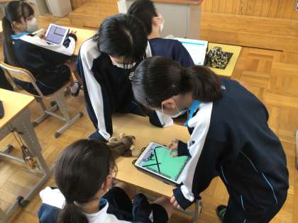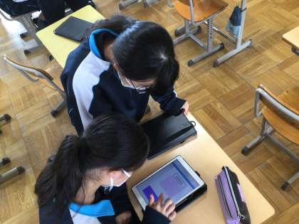 1年生が後期の準備をしていました。委員会や学級の係を決め、学習用タブレットを活用して掲示物のアイディアを考えていました。
