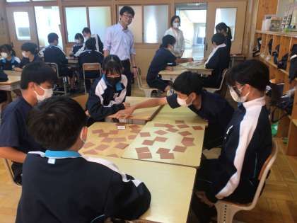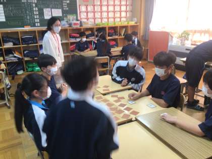 1年生の英語科の授業の様子です。ALTの先生と一緒にゲームを楽しんでいました。カードには、英単語が書かれています。
