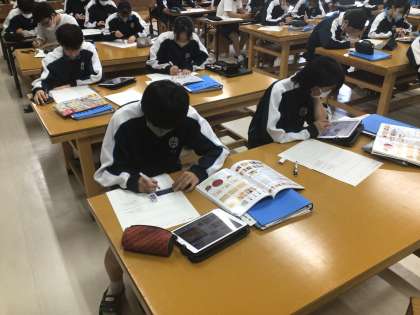 3年生の美術科の授業の様子です。木箱のデザインを考えていました。卒業に向けての作品となります。生徒は、学習用タブレットを活用して、いろいろな資料を調べながら、構想を練っていました。