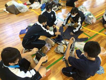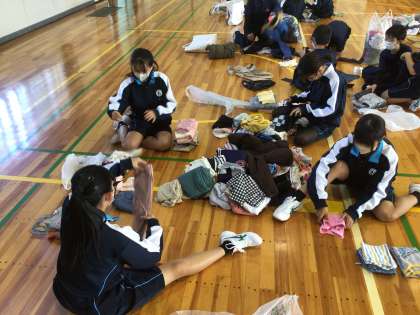 1年生の総合的な学習の時間の様子です。服の仕分けをしていました。生徒は、回収された多くの服を、笑顔で仕分けし、たたんでいました。