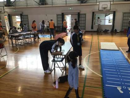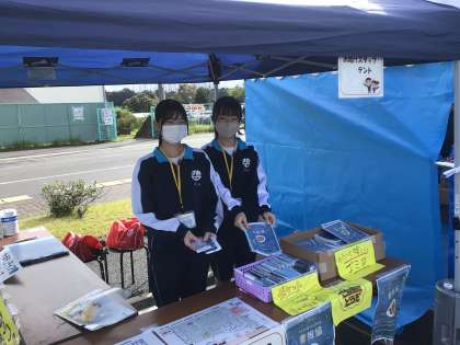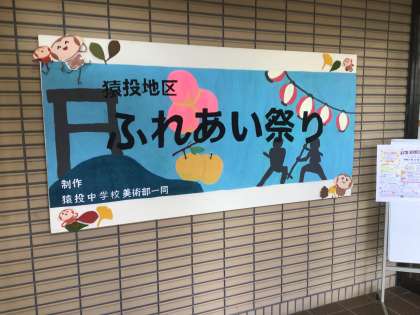 本日(10/15)、猿投北交流館で「ふれあいまつり」が行われています。本校生徒が約60名ほど、ボランティア活動をしています。また、交流館入り口には、美術部が製作した看板が設置されています。このあと、ブラスバンド部の演奏も行われます。