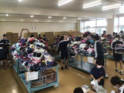 服のチカラプロジェクトの様子です。先週金曜日までの2週間にわたって服の回収をしてきました。多くの方々のご協力のおかげで、予想をはるかに上回る服を回収することができました。本当にありがとうございました。生徒は、回収された服をサイズや長半袖などに分けて整理を進めています。