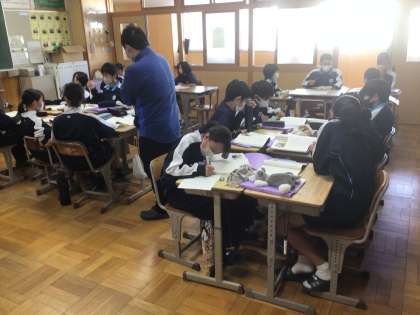 1年生の国語科の授業の様子です。人物相関図をつくり、話の内容を読み取っていました。仲間と話し合いをしながら、学びを深めていました。
