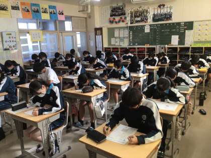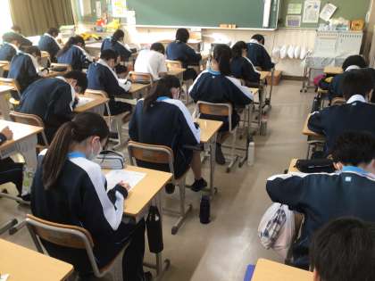 3年生の社会科の授業の様子です。日本国憲法と国の政治のしくみに関する復習問題に取り組んでいました。1か月後には、後期中間テストが予定されています。生徒は、楽猿祭の準備もありますが、学習にも力を入れていました。