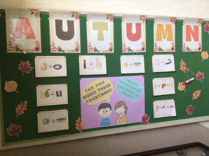 英語科の掲示板です。秋になり、掲示の内容が変わりました。行ってみたい国はどこですか。8つの国が掲示されています。考えてみましょう。