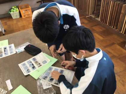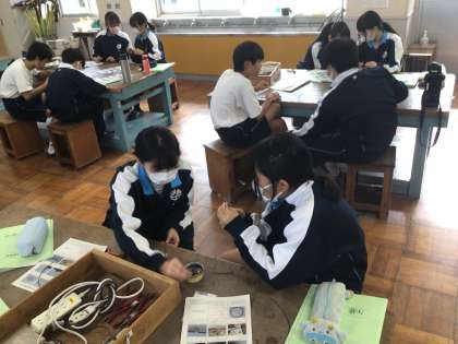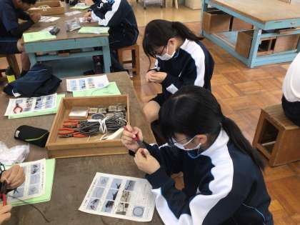 2年生の技術科の授業の様子です。コードを接合することに取り組んでいました。はんだでつけるために、準備をしていました。手先の器用さが必要な作業でした。