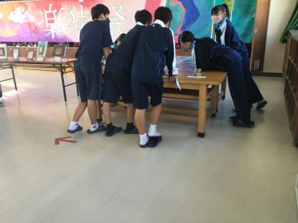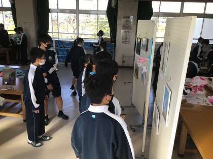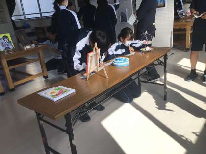 美術部の作品展示をしています。楽猿祭当日だけでは、生徒がゆっくりと見ることができないため、今週月曜日から生徒向けに実施しています。多くの生徒が作品を見て、感想やメッセージを書いていました。